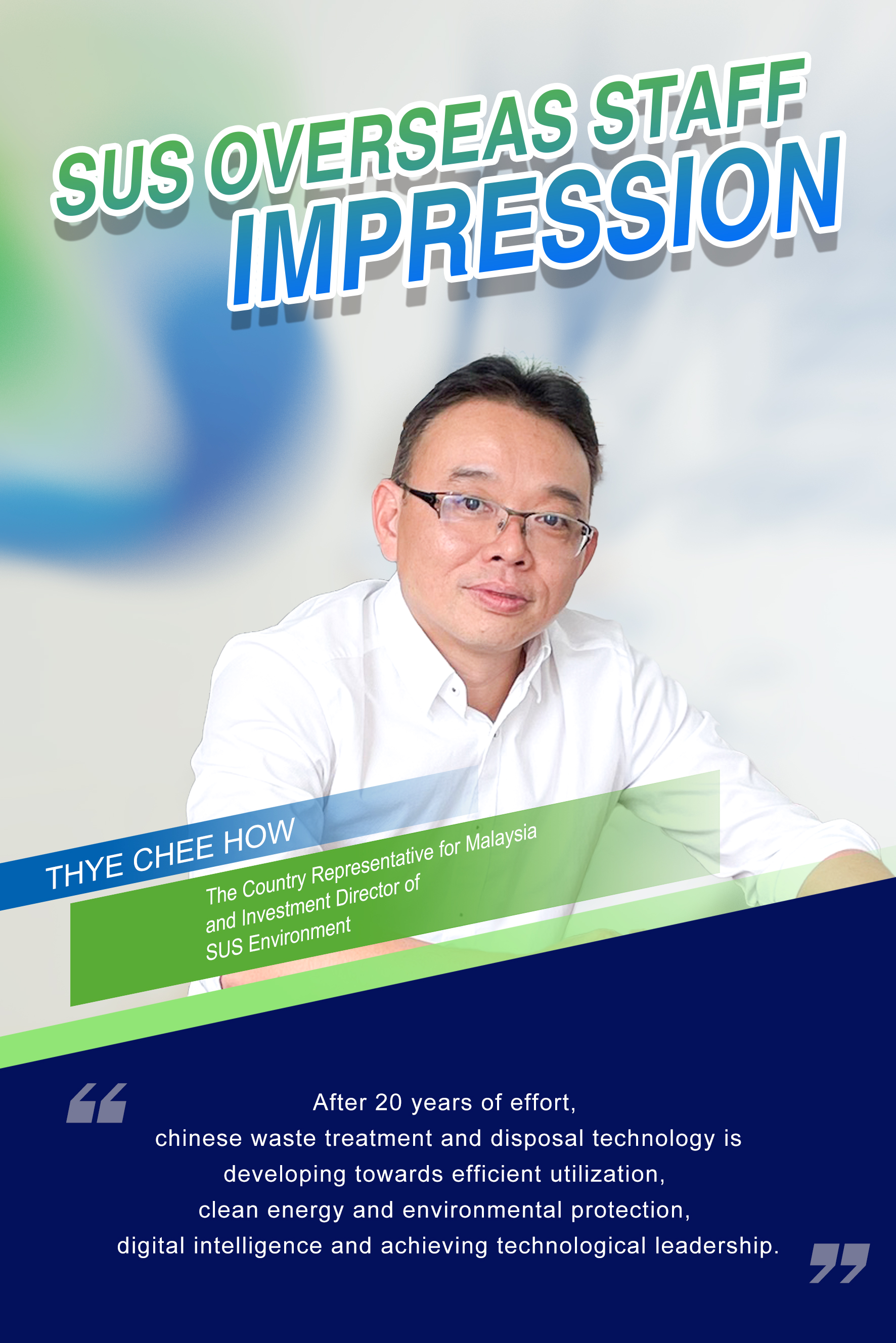 THYE CHEE HOW from Malaysia has been working in a China-invested company since 2017, he has more than 10 years of working experience in the environment and energy industry. In 2021, he joined SUS Environment, and now he serves as the Country Representative for Malaysia and Investment Director of SUS Environment.